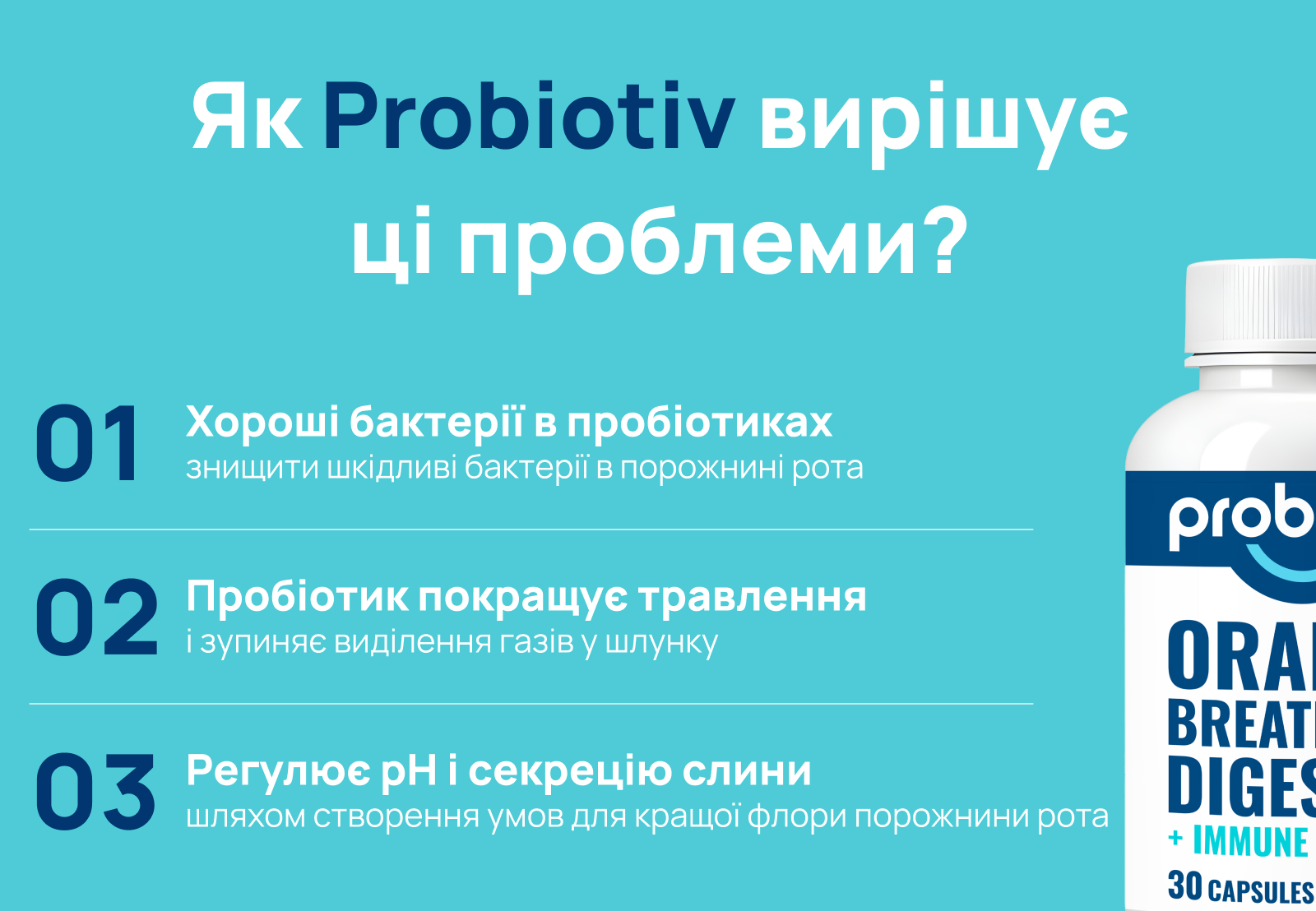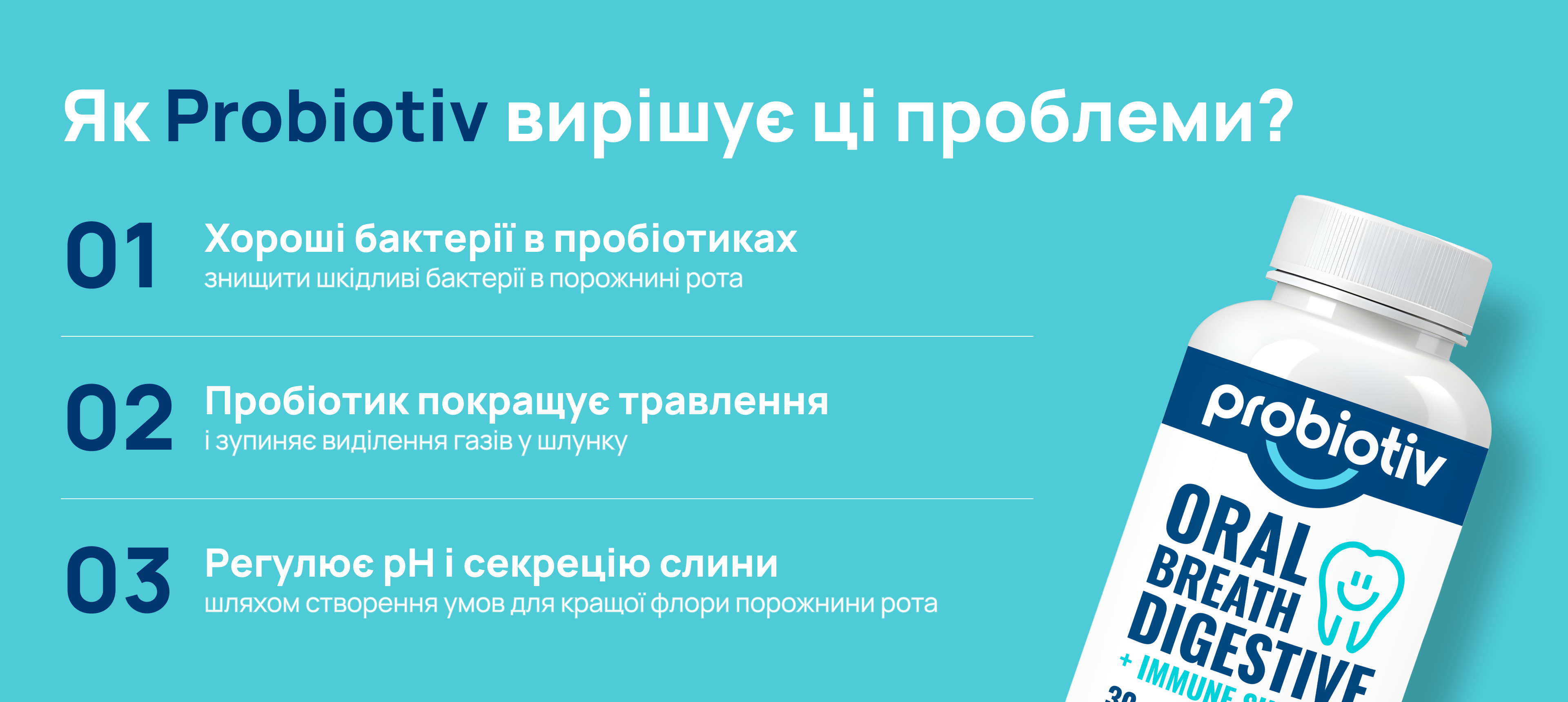 Корисні бактерії в пробіотику знищують шкідливі мікроби з сигарет та їжі, які викликають неприємний запах з рота.
